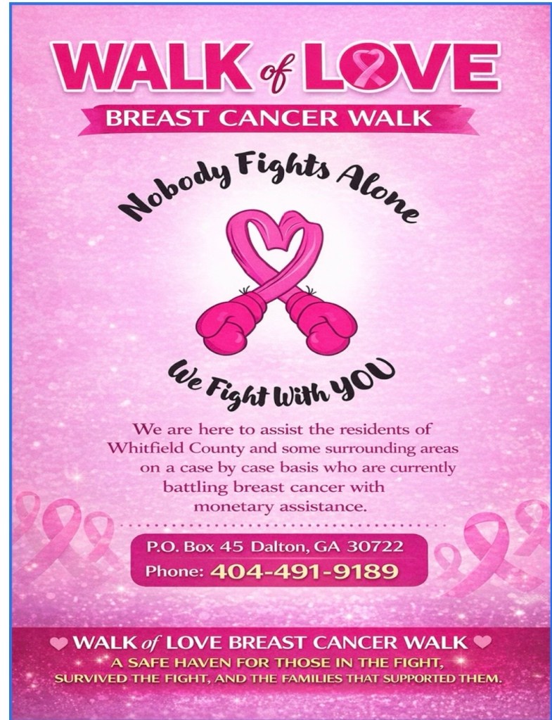 Founded in 2023, Walk of Love is dedicated to supporting individuals in Whitfield County who are currently battling breast cancer. Our mission is to provide assistance, encouragement, and essential supplies—such as turbans, scarves, bras, padding, prostheses, and other resources—during this challenging time.
